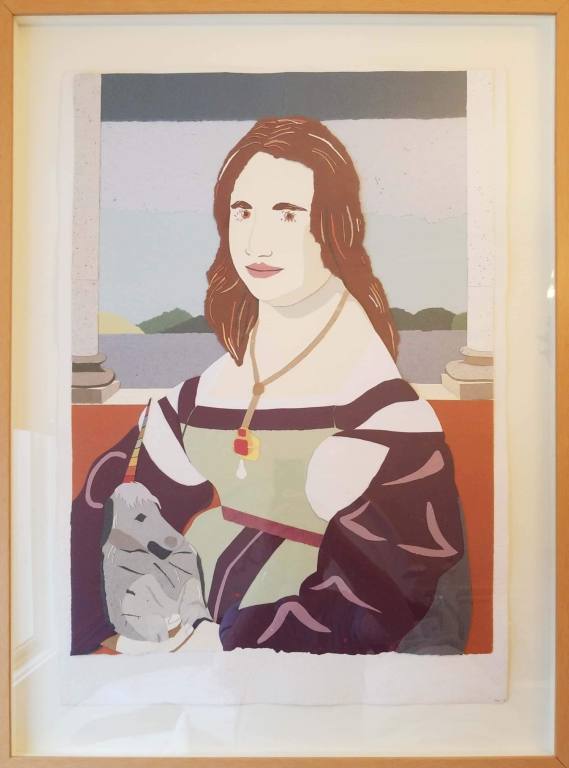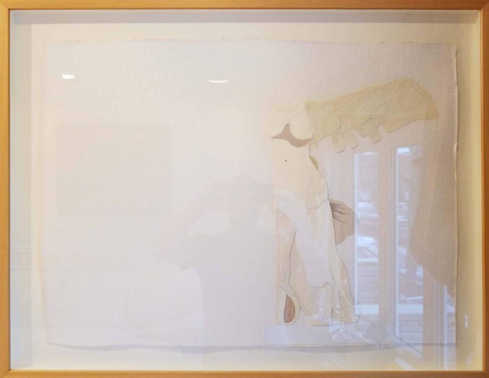 The image of a park was the first one that I made. In it, I included a little "rules" sign similar to those that have become ubiquitous in society lately, but I have added a few rules of my own as a comment on how far things have gone. |  | | The second collage in the series is my take on Nike, Victory at Samothrace. In this work I am mainly experimenting with the many tonalities of white paper that I was able to find at St Armand Paper. |  | | "Girl with a Unicorn" is based upon a similarly named painting by Raphael. Raphael based his image on La Giaconda, but he added the Unicorn as at that time the unicorn symbolized chastity. He also added the ruby necklace, which implied that the sitter was wealthy. |  |